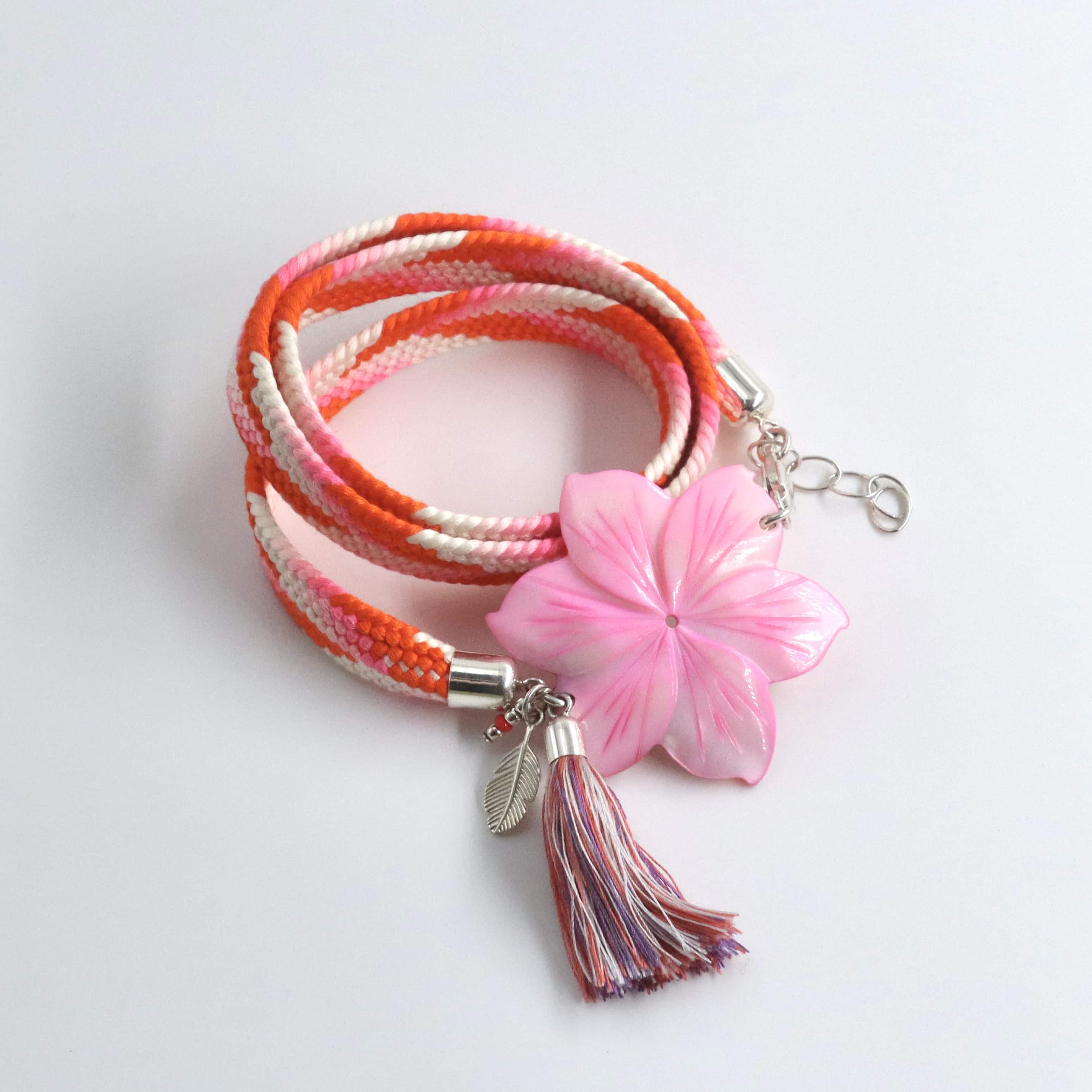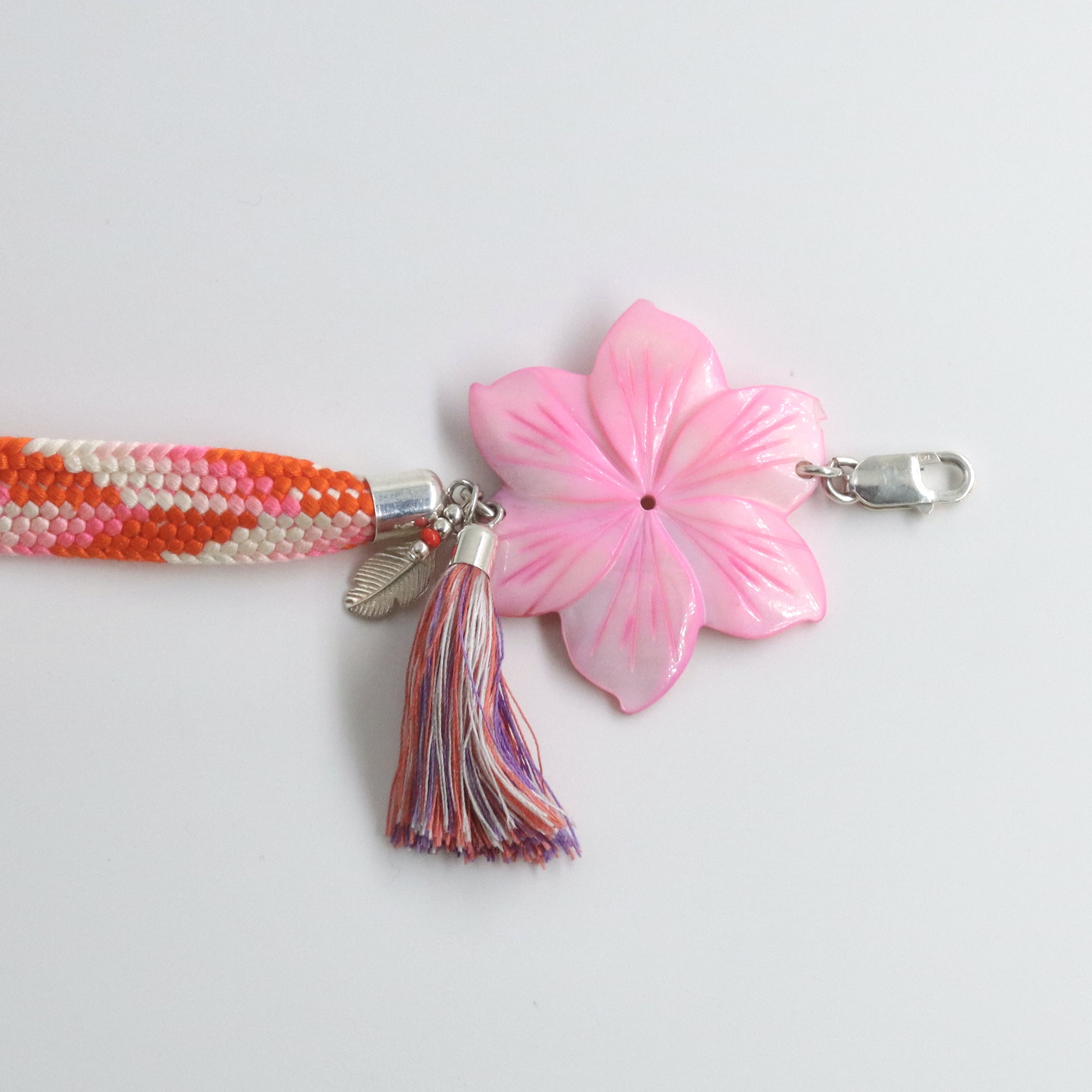 Band und Quaste Seide. Blüte Perlmutt, Verschluss, Fassung und Anhänger 925Silber.