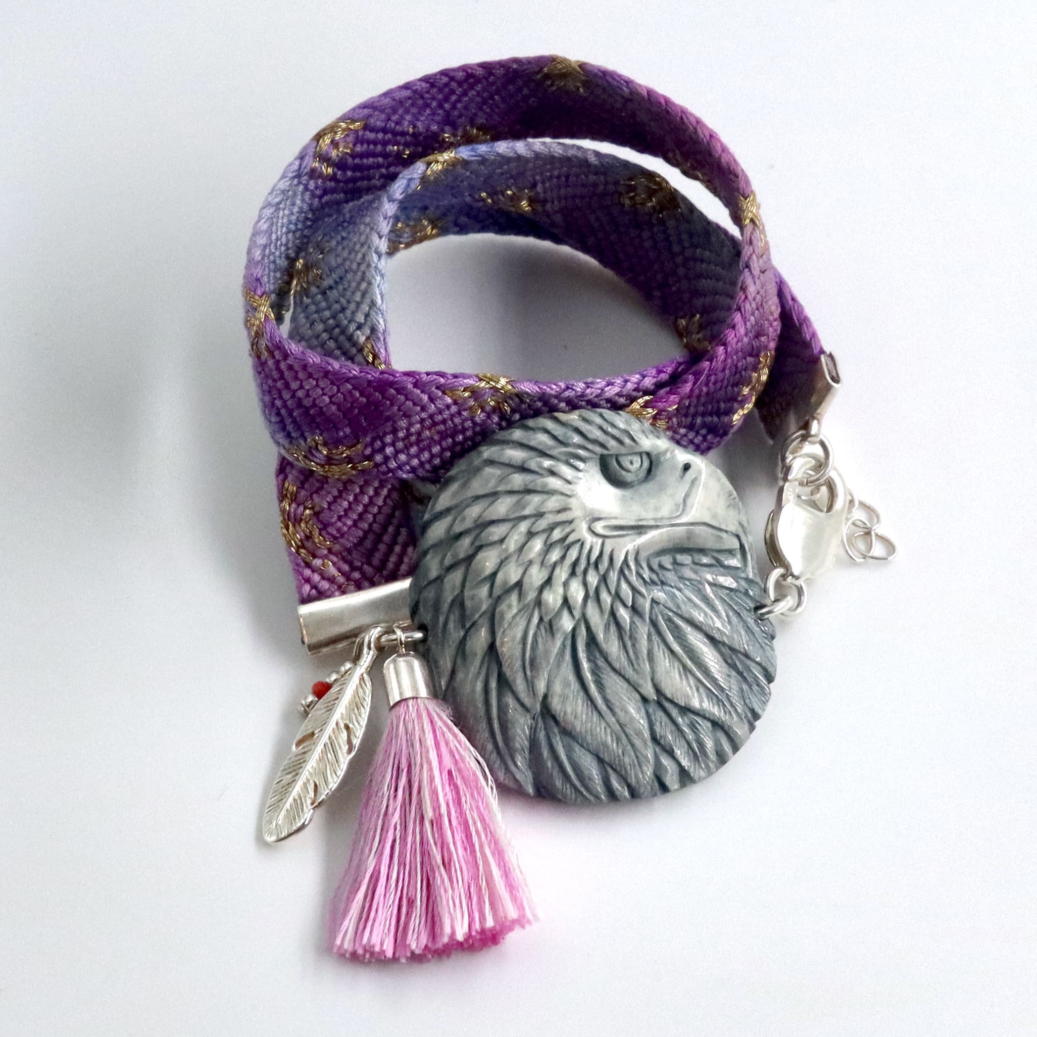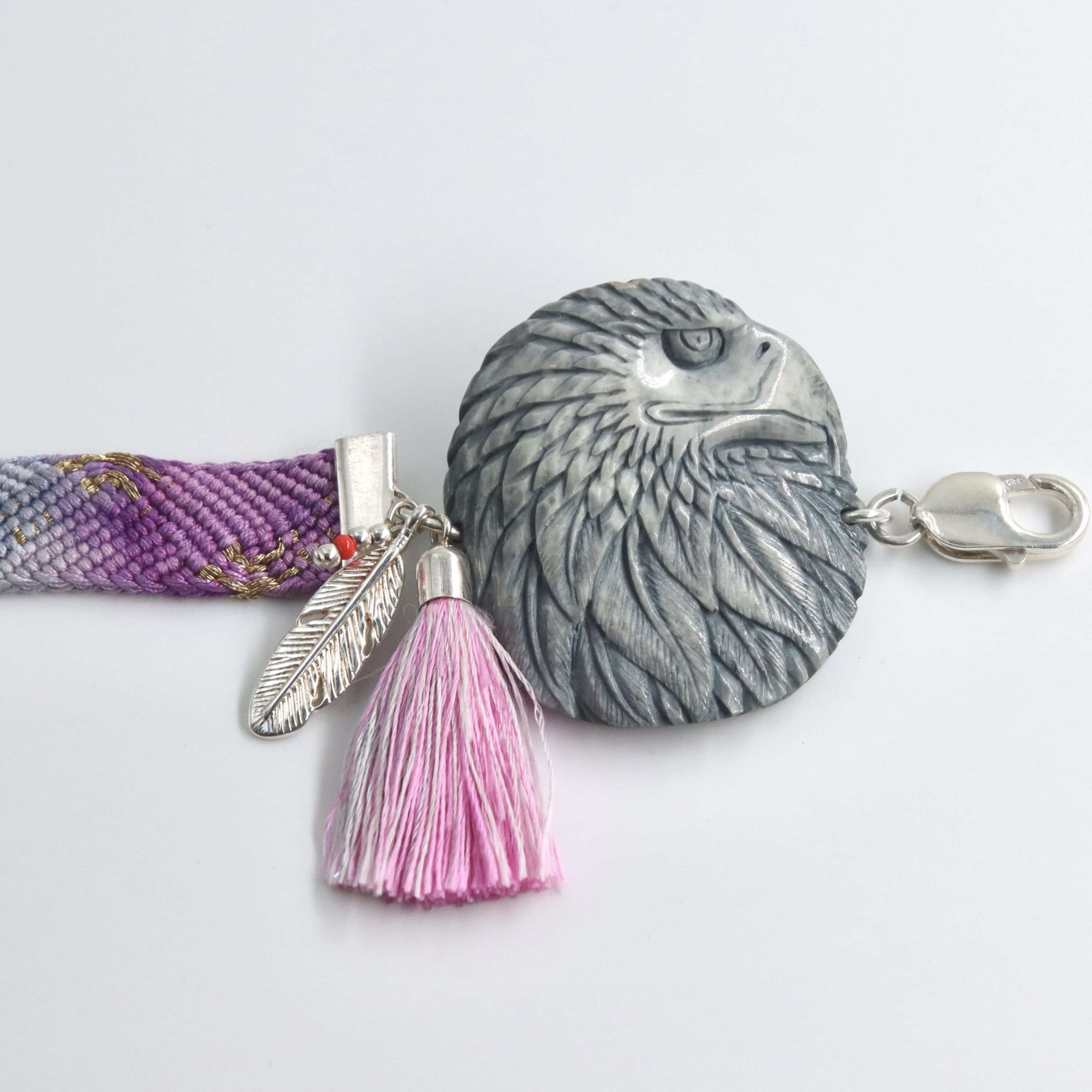 Band und Quaste Seide. Adler Horn, Verschluss, Fassung und Anhänger 925Silber